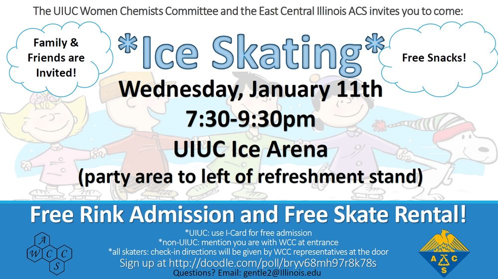 The Women Chemists Committee along with the East Central Illinois ACS will be co-hosting an Ice Skating event on Wednesday, January 11th from 7:30-9:30 pm at the UIUC Ice Arena (406 E Armory Ave., near the corner of 4th and Armory). All the East Central Illinois local section members are invited. Feel free to bring your family and friends! Admission and skate rental is FREE, even for non-UIUC family members. Light snacks provided in party area to left of refreshment stand. Please RSVP here: Doodle: 2017 ECI-WCC Ice Skating