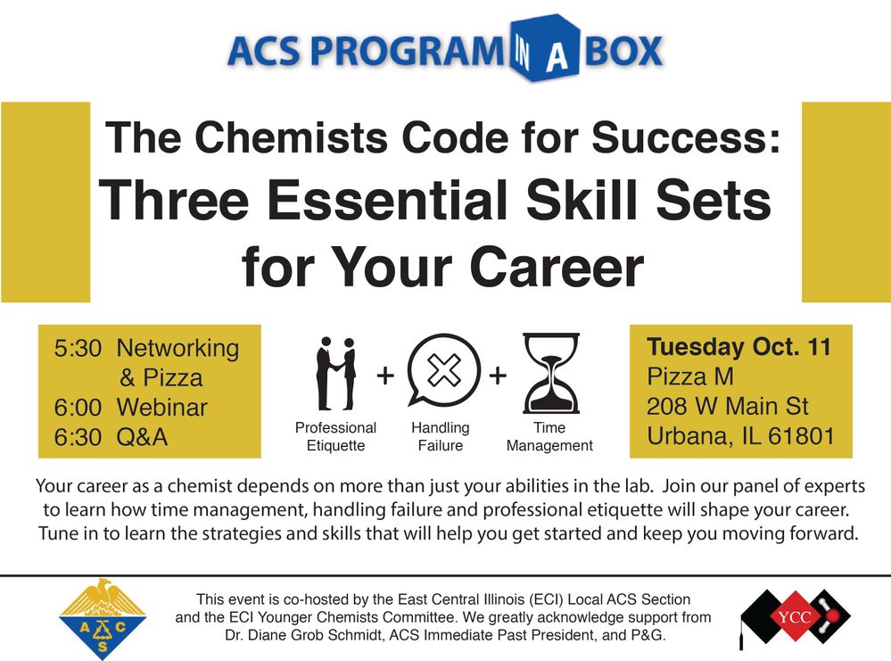 Join us on Tuesday, October 11th at 5:30 p.m. at Pizza M as the ECI Local Section and its Younger Chemists Committee learn about 3 Essential Skills Sets for succeeding in chemistry! This program-in-a-box webinar event will describe how your career as a chemist depends on more than just your abilities in the lab. There will be panel of experts talking about time management, handling failure, and professional etiquette will shape your career. The webinar starts at 6, but come early to network with fellow chemists over pizza!